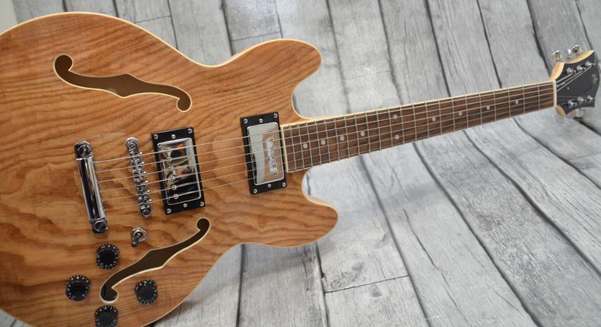 The semi-hollow body with ash veneers on the front and back features a dual humbucker setup, with discrete volume and tone knobs per pickup and a 3-way pickup toggle. There are two separate volume and tone knobs for dialing in your desired tone. There is one 1/4" standard guitar output jack on the side of the guitar body.