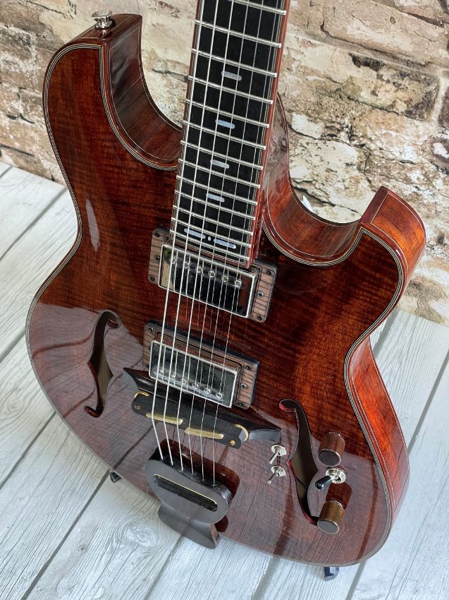 The fully hollow archtop body features a mahogany side, a solid spruce back, and a solid flame maple top, with a dual humbucker setup, discrete split coil switches and a 3-way pickup toggle for 8 different tone combinations! There is one master volume and one master tone knob for dialing in your tone.  The guitar strings pass over a floating bridge that is not anchored to the guitar body. Similar to a violin, banjo or mandolin bridge, the bridge simply rests on top of the body and is held in place by string tension.  The ebony tailpiece is attached to the end of the guitar, holding the strings in place.  There is one 1/4" standard guitar output jack on the side of the guitar body.  Reprise ships inside a custom Hard Shell Case.