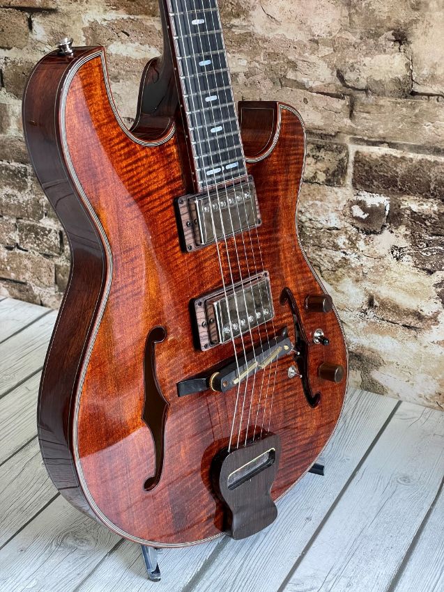 Our small team of expert luthiers overseas build jazz arch top guitars and every detail of Reprise is drawn from that tradition.