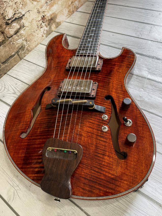 The Phred Instruments Reprise is a small body archtop guitar: hand built, carved top and back, sides moulded and shaped to form, all solid woods, parallel bracing, kerfing, and fully hollow.