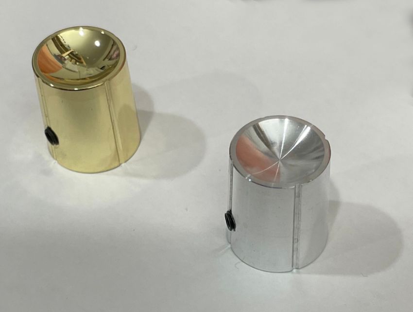 The Phred Instruments Hi-Phi Aluminum guitar knob is similar to the knobs installed on Jerry Garcia's Wolf guitar by Doug Iwrin, and Travis Bean TB500 guitar. Available in Aluminum or Gold-Plated Aluminum. Quantity can be adjusted in the cart after adding the item to your cart. Maximum of 4 per customer. If you would like to add brass to your existing order, please visit our UPGRADE PAGE.