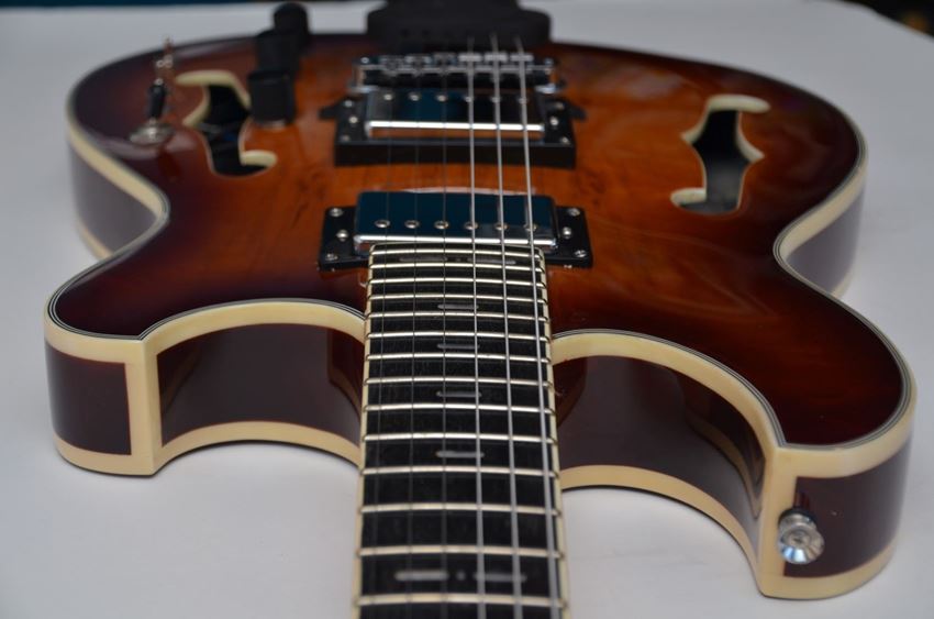 The fully hollow body with a flame maple veneer on the front features a dual humbucker setup, with discrete split coil switches and a 3-way pickup toggle for 8 different tone combinations! There is one master volume and discrete tone knobs for shaping your tone.  The guitar strings pass over a floating bridge that is anchored to the guitar body on one side. Similar to a violin, banjo or mandolin bridge, the bridge simply rests on top of the body and is held in place by string tension.  The ebony tailpiece is attached to the end of the guitar with a solid steel bracket, holding the strings in place.  There are two 1/4" output jacks on the side of the body.  One of them is a standard guitar output to plug in a standard guitar cable.  The other output is used for the built-in on board effects loop (OBEL), allowing you to gain further control of the sound coming from your effects pedals.  Scroll down below to read up on the benefits of having an OBEL equipped guitar.  On the back of the guitar, there is a accessible electronics cavity and a 9V battery box that powers the internal built-in preamp.  The built-in pre-amp boosts the signal a small amount and lowers the output resistance so that the signal is better preserved along the guitar cable to your amp. We offer a custom hard shell case to go with the Ernesto guitar.